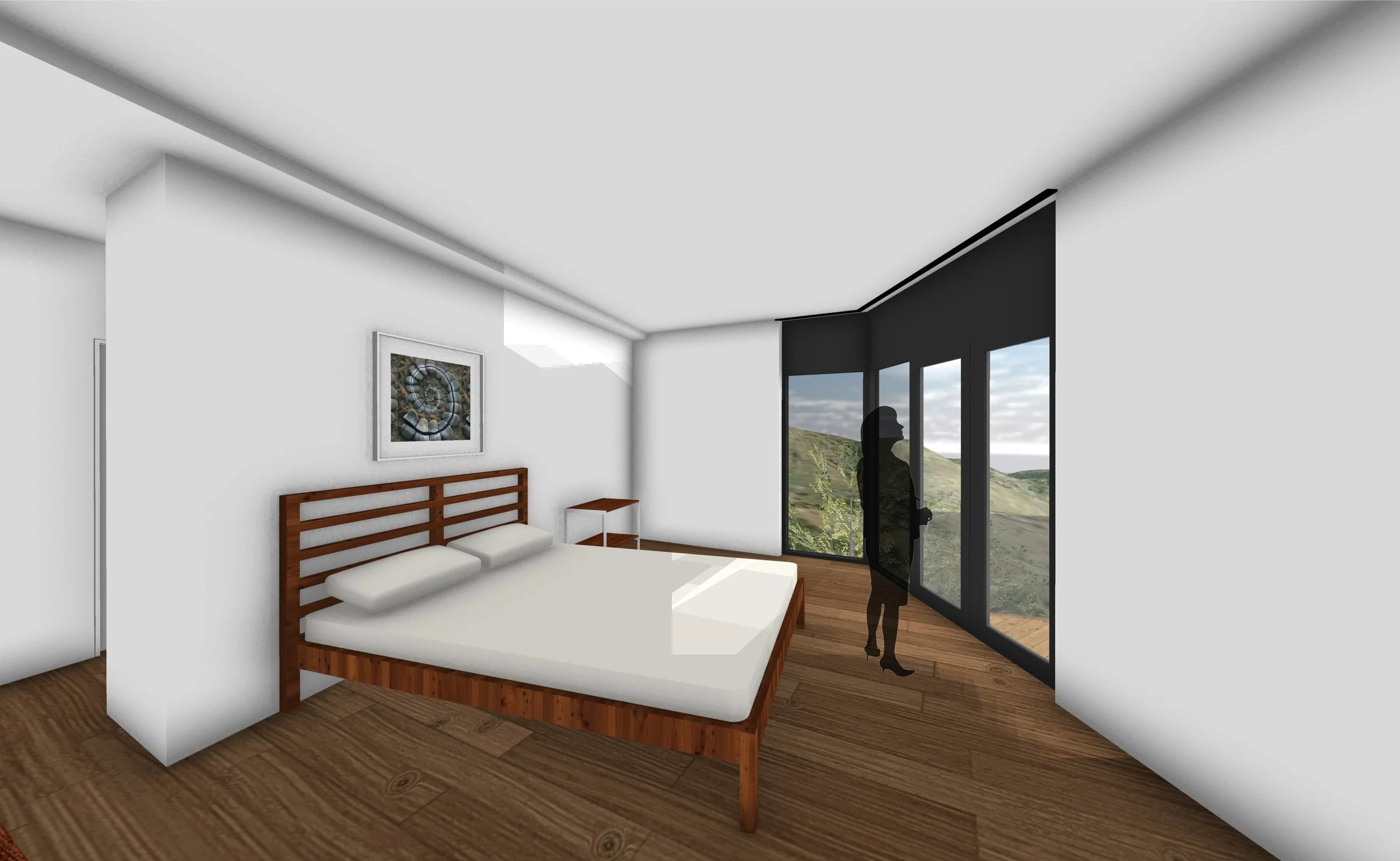 The interior features a sunken family room set up for the best views down the mountains, a central kitchen area with operable clerestory windows for enhanced natural ventilation, and a visually stunning Torii Gate hallway sequence that passes through a hallway that narrows in both width and height leading to two bedrooms, and office and a work out room. The cantilevered wrap around deck makes you feel like you are flying through the valley.